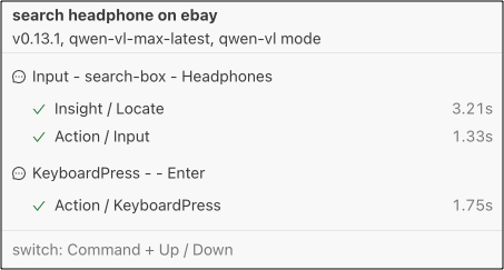 为了解决这个问题,我们引入了 aiTap(), aiHover(), aiInput(), aiKeyboardPress(), aiScroll() 接口。这些接口会直接执行指定的操作,而 AI 模型只负责底层任务,如定位元素等。使用这些接口后,整个过程可以明显更快和更可靠。