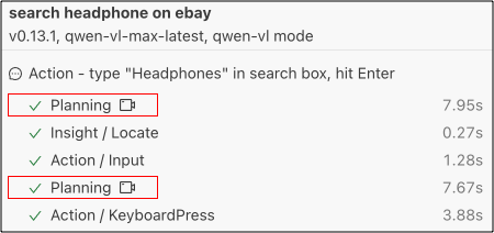 在接口的背后 ,Midscene 会调用 LLM 来规划步骤并执行它们。你可以在报告中看到整个过程。这是一个非常常见的 AI Agent 运行模式。